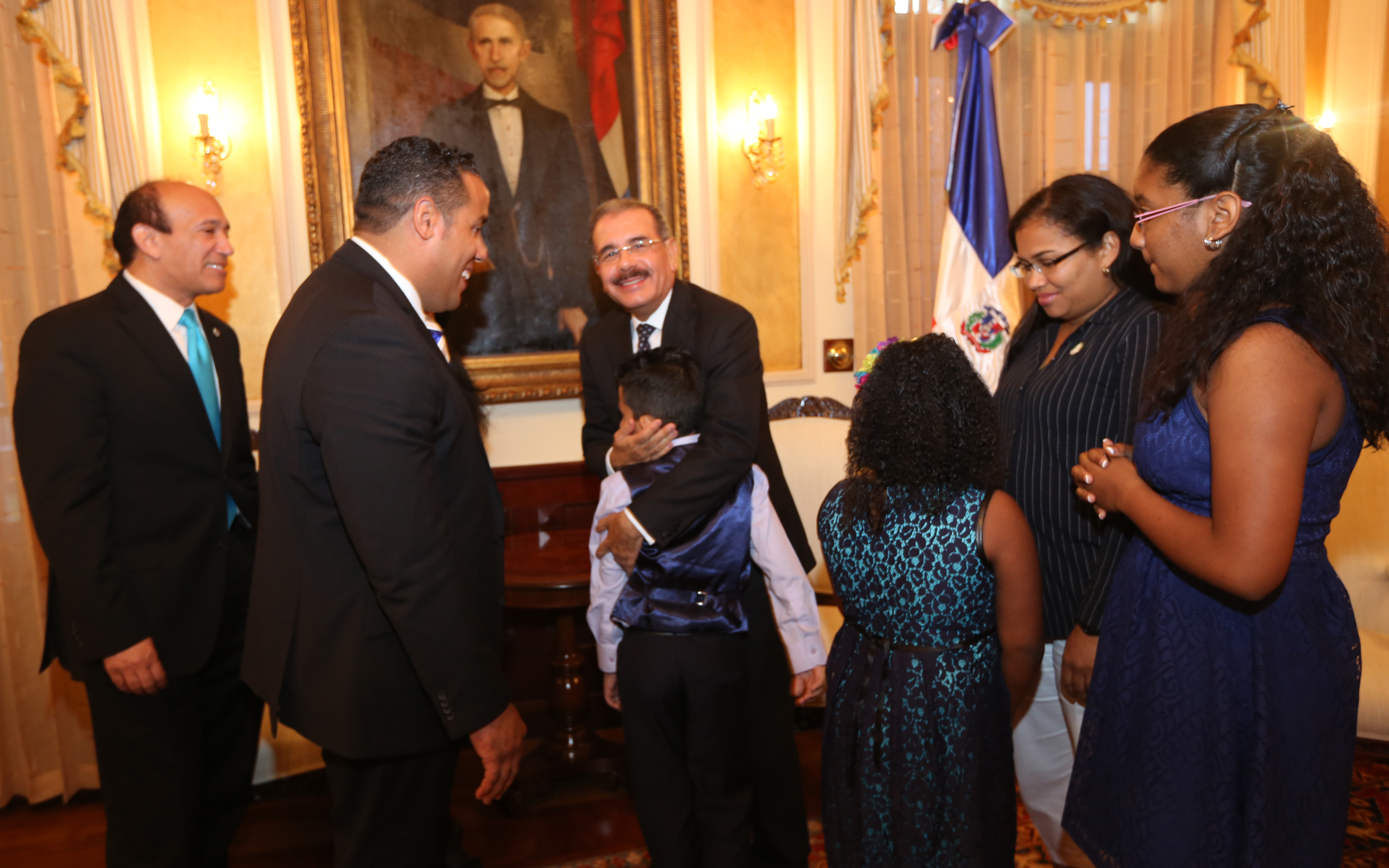 El Mandatario al recibir los estudiantes meritorios, quienes asistieron acompañados del comisionado del Departamento de Educación de la ciudad de Paterson, Alex Méndez; las madres de los estudiantes, Esperanza Rubina García, Wendoly Yissel Paulino Medrano, Yvelise Altagracia García Méndez, junto otros.