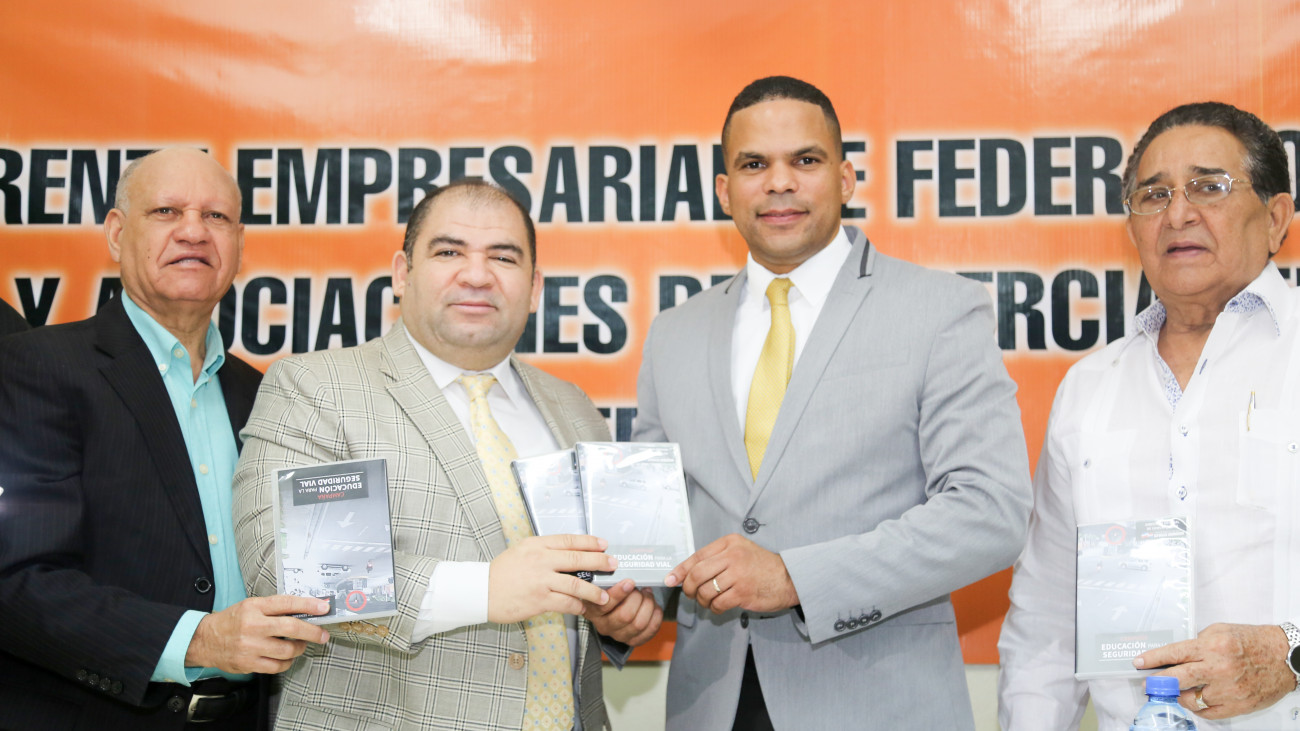 Moisés González, director de distribución de Gestión Comunicacional de DICOM entregó a Jhovanny Leyba, presidente de la Federaciones y Asociaciones de Comerciantes (FEFAC), el material de apoyo de la campaña Educación de Seguridad Vial que difunde la Presidencia.
