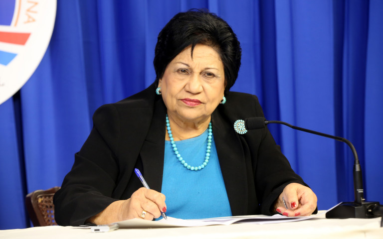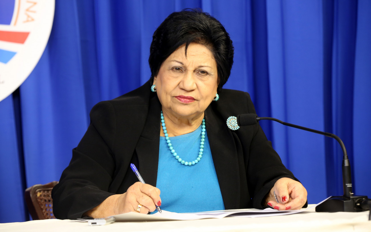 Doña Ligia Amado Melo, ministra de Educación Superior (MESCyT), captada durante su participación en el Encuentro Semanal con los Medios celebrado en el Salón Orlando Martínez, del Palacio Nacional.