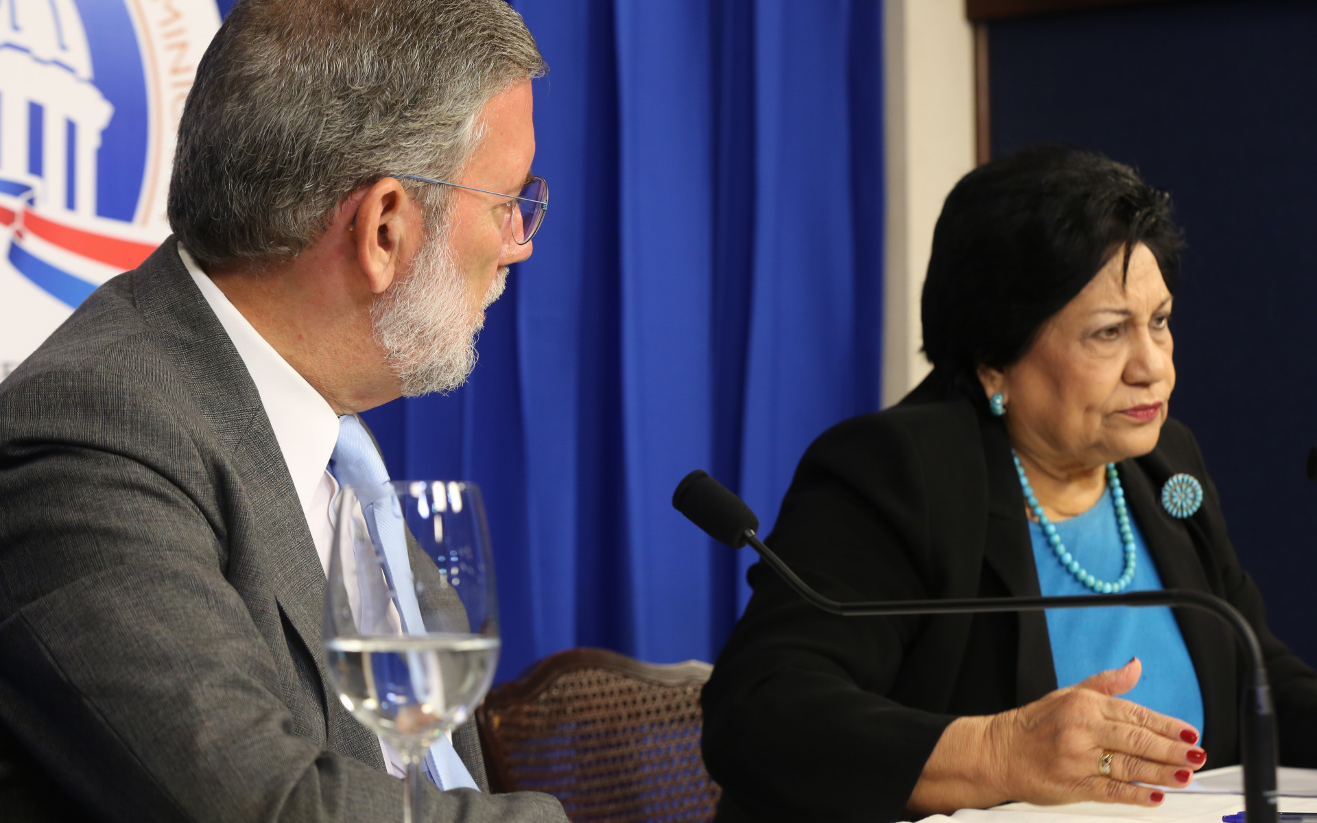 Don Roberto Rodríguez Marchena, director de DICOM y la ministra de Educación Superior, Ciencia y Tecnología (MESCyT), doña Ligia Amada Melo, durante el desarrollo del encuentro efectuado hoy en el Salón Orlando Martínez del Palacio Nacional.