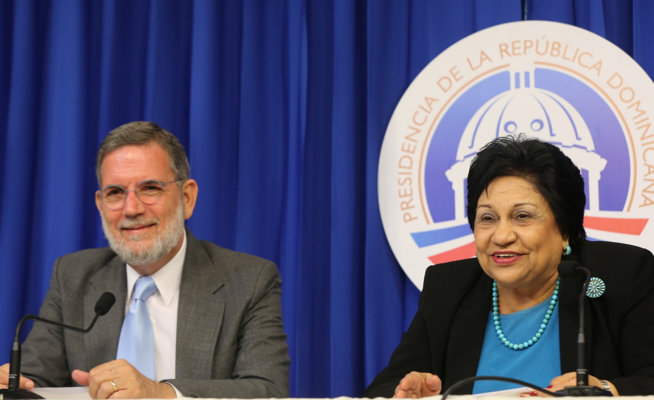 Don Roberto Rodríguez Marchena, director de DICOM y la ministra de Educación Superior, Ciencia y Tecnología (MESCyT), doña Ligia Amada Melo, durante el desarrollo del encuentro efectuado hoy en el Salón Orlando Martínez del Palacio Nacional.