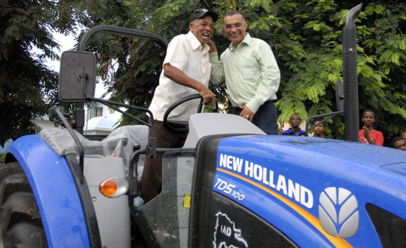 El director del Instituto Agrario Dominicano (IAD), Radhamés Valenzuela y el representante de la Asociación de Agricultores La esperanza, en Sabana Grande de Palenque, San Cristóbal, recibe uno de los dos tractores agrícolas con sus rastras, dispuestos por el presidente Danilo Medina en su pasada visita a la zona.