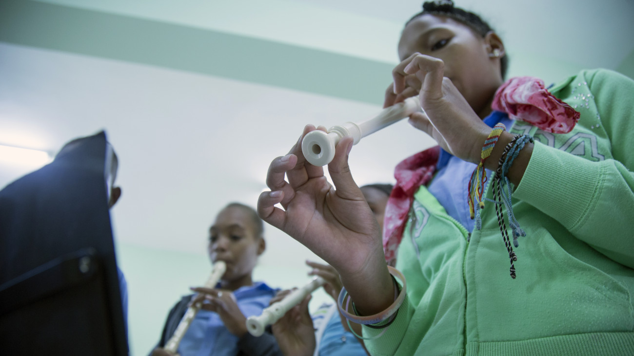 Jóvenes y niños residentes en La Nueva Barquita valoran y agradecen la oportunidad de aprender en la escuela de música de su nuevo hogar.