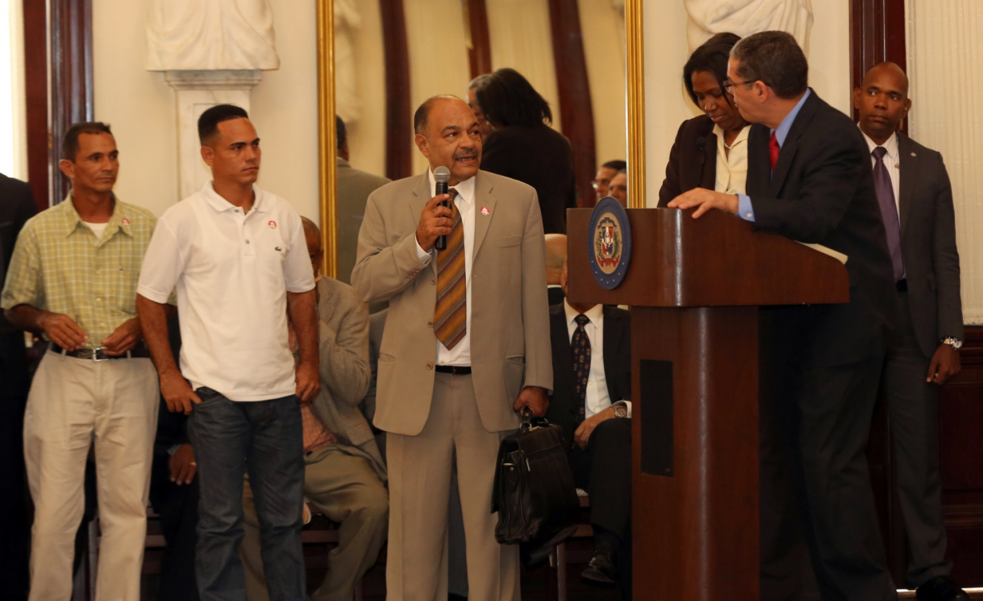 Carlos Amarante Baret, ministro de Educación, con los señores Juan Bautista Díaz y José Rafael Díaz, durante el desarrollo del encuentro, efectuado hoy en el Salón Las Cariátides del Palacio Nacional.