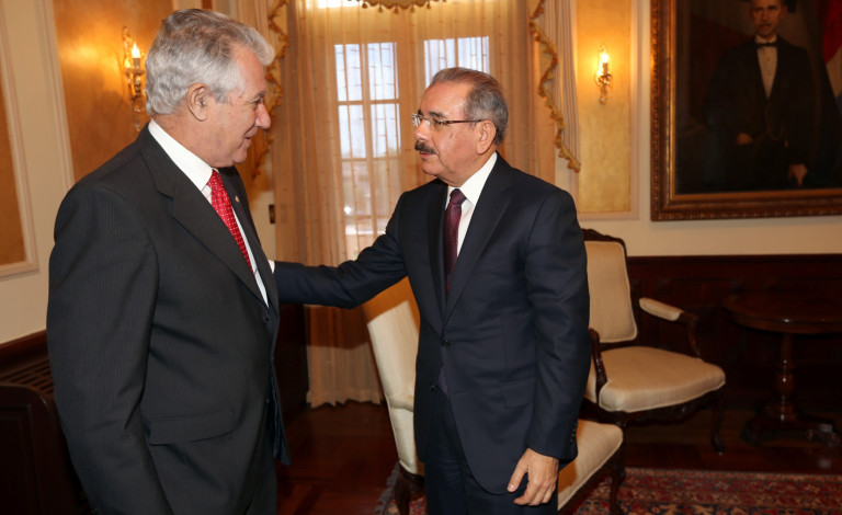 El presidente Danilo Medina y el embajador de la República de Uruguay en el país, Luis Carresse, durante visita protocolar efectuada hoy en el Palacio Presidencial, con ocasión de su despedida como diplomático del hermano país.