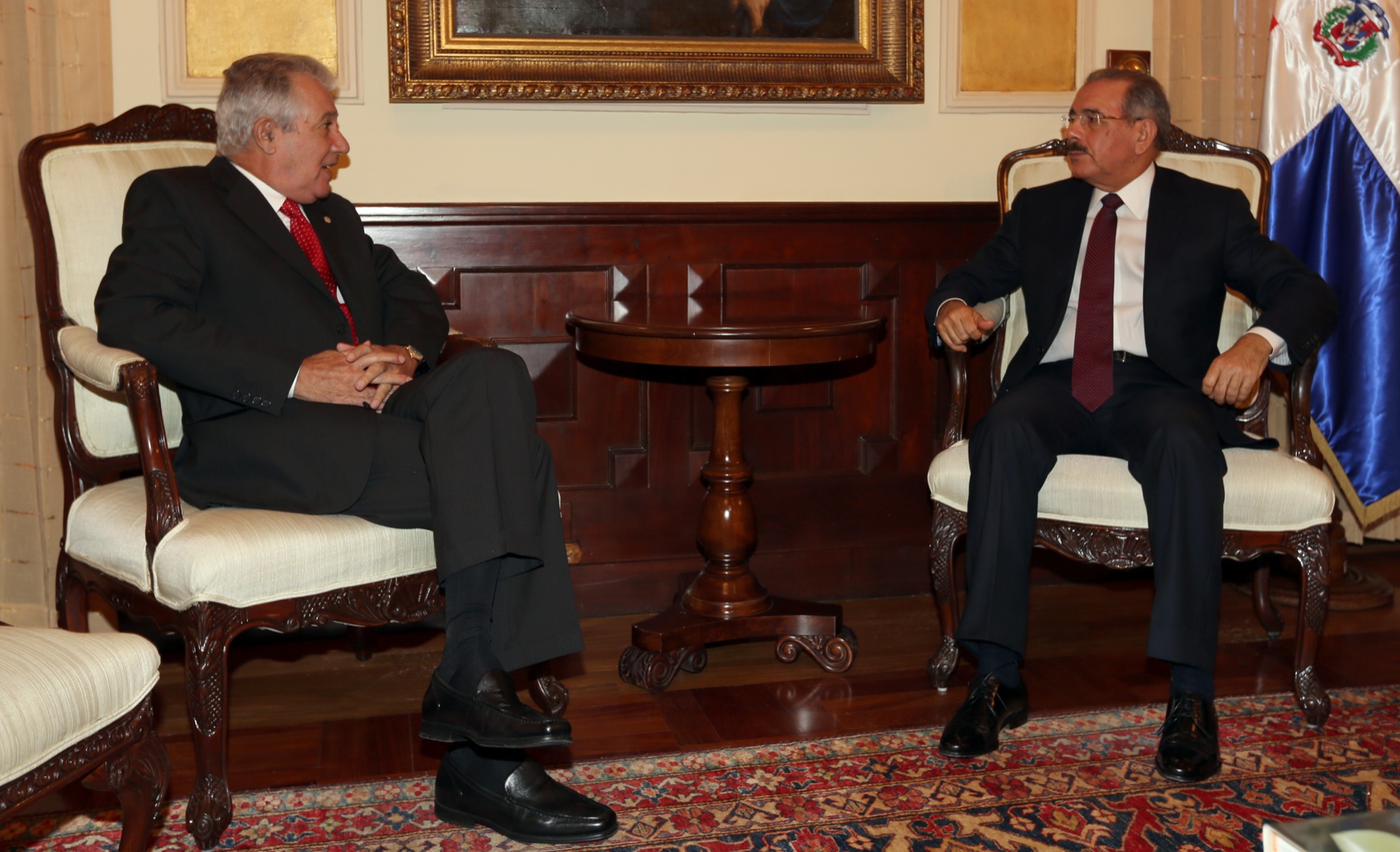 El presidente de la República, Danilo Medina y el embajador de la República de Uruguay en el país, Luis Carresse, durante visita protocolar efectuada hoy en el Palacio Presidencial, con ocasión de su despedida como diplomático del hermano país.