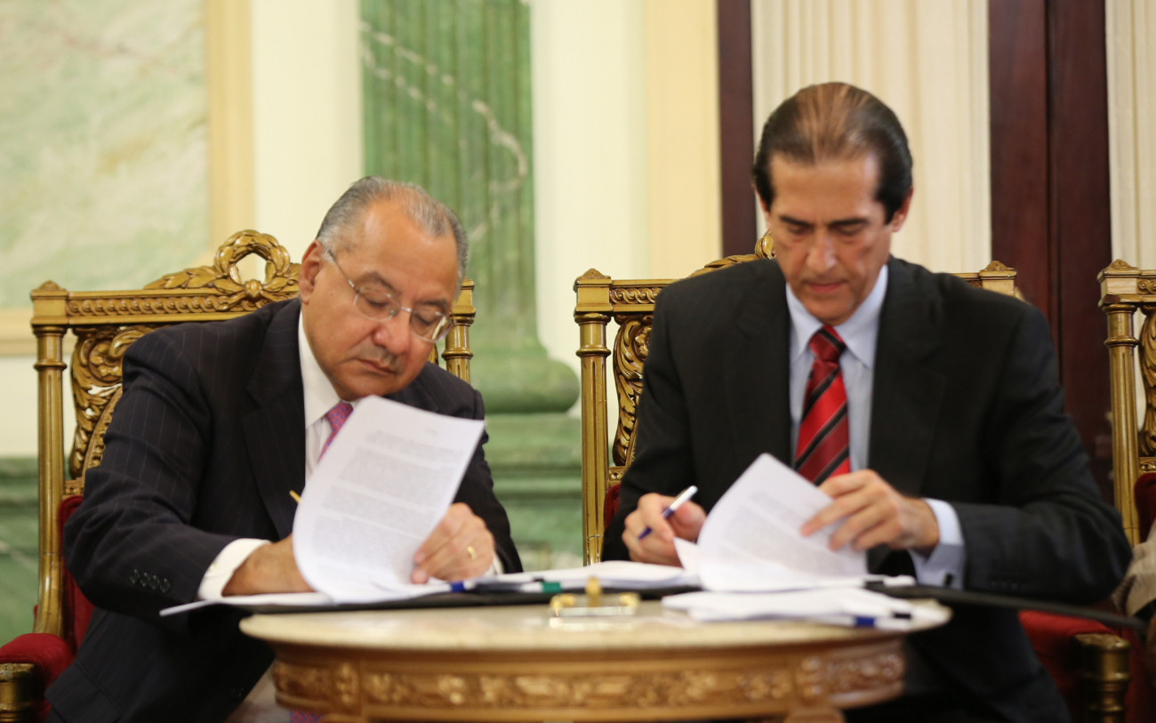 Participación de Gustavo Montalvo, ministro de la Presidencia y Manuel Rocha, presidente de Barrick Gold para República Dominicana, presentes durante acto de firma de la Segunda Enmienda del Acuerdo entre el Estado y la empresa minera, el cual garantiza que el gobierno recibirá ingresos de alrededor de US$11,615 millones.