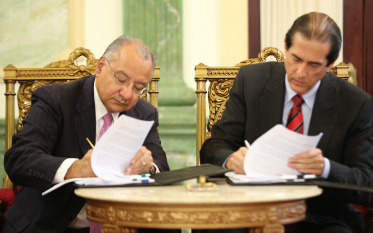 Gustavo Montalvo, ministro de la Presidencia y Manuel Rocha, presidente de Barrick Gold para República Dominicana, firman la segunda enmienda del acuerdo entre el Estado y la empresa minera, durante acto efectuado en el Palacio Presidencial, en presencia de ministros, funcionarios y altos ejecutivos de ambas partes.