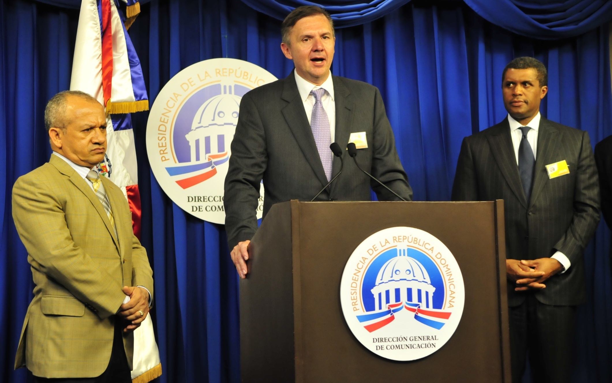 Mario J. García, médico dominicano y director de la división de Cardiología del Hospital Montefiore, presente durante conferencia de prensa celebrada en el Salón Orlando Martínez, del Palacio Nacional. Figuran además el ministro de Salud Pública, Freddy Hidalgo Núñez y Phillip O. Ozuah, vicepresidente ejecutivo del citado hospital.