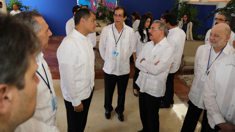 El presidente Danilo Medina mientras conversa con el presidente de Ecuador, Rafael Correa. Le acompañan el ministro de la Presidencia, Gustavo Montalvo; el ministro administrativo, José Ramón Peralta y el señor César Medina, viceministro de Política Exterior Bilateral del Ministerio de Relaciones Exteriores, entre otros.