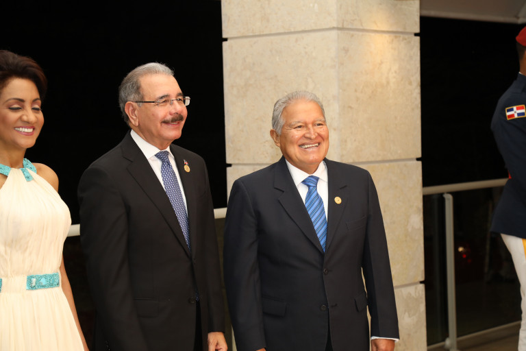 Desde la izquierda, Cándida Montilla de Medina, Danilo Medina y el presidente de El Salvador, Salvador Sánchez Cerén.