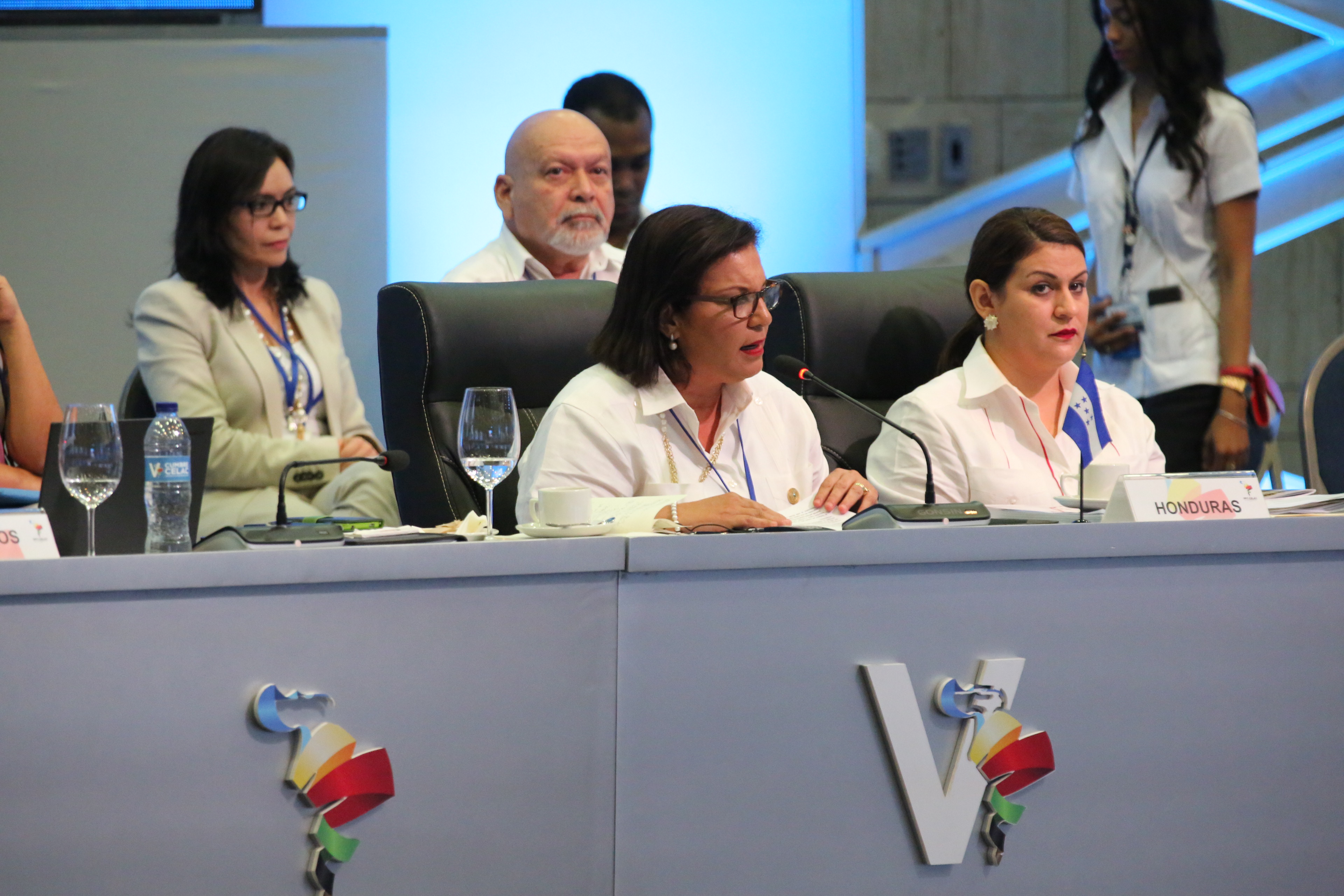 La vicepresidenta de Honduras, Rossana Guevara, agota su turno en la cumbre de la Celac.