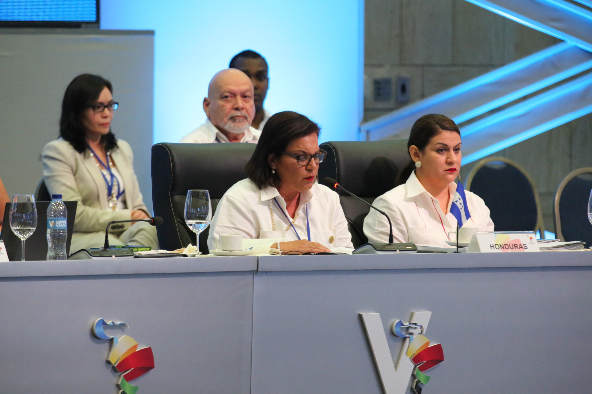 La vicepresidenta de Honduras, Rossana Guevara, agota su turno en la cumbre de la Celac.