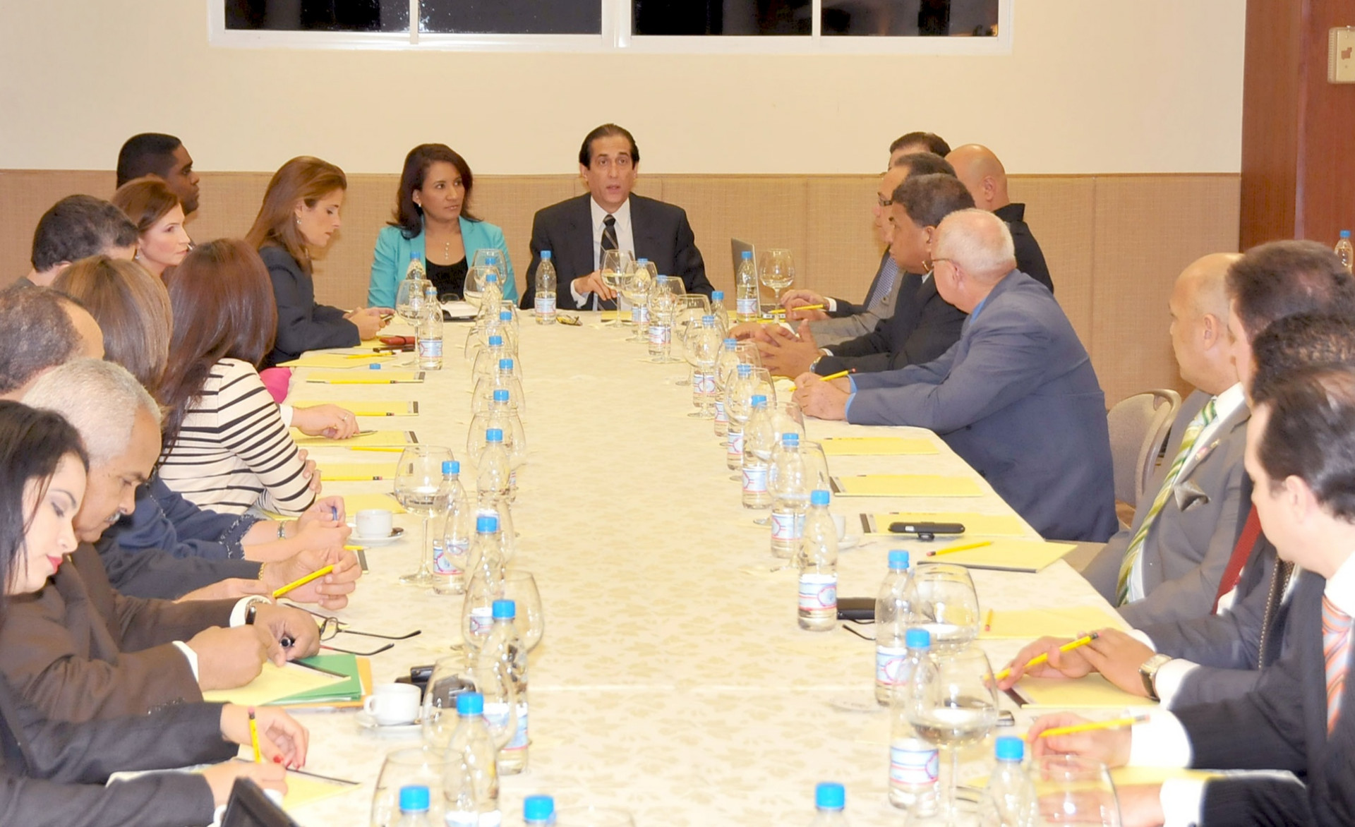 El ministro de la Presidencia, Gustavo Montalvo, mientras ofrece detalles a los empresarios presentes en el encuentro sobre el Sistema Nacional de Emergencias y Seguridad 9-1-1, efectuado hoy en el Salón Hermanas Mirabal, del Palacio Nacional.
