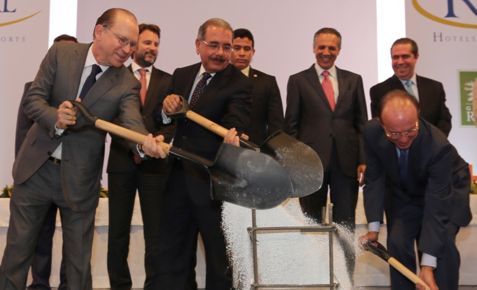 El presidente Danilo Medina al encabezar el ceremonial del primer palazo, por inicios de trabajos de construcción acompañado de Álvaro Diago, director de Operaciones para Latinoamérica y el Caribe de InterContinental Hotel; Ricardo Poma, presidente del Grupo Poma; y Fernando Poma, vicepresidente ejecutivo de Real Hotels and Resorts. Figuran además Jean Alain Rodríguez, director del Centro de Inversión y Exportación (CEI-RD); el ministro administrativo de la Presidencia, José Ramón Peralta; Francisco Javier García, ministro de Turismo entre otros invitados especiales.