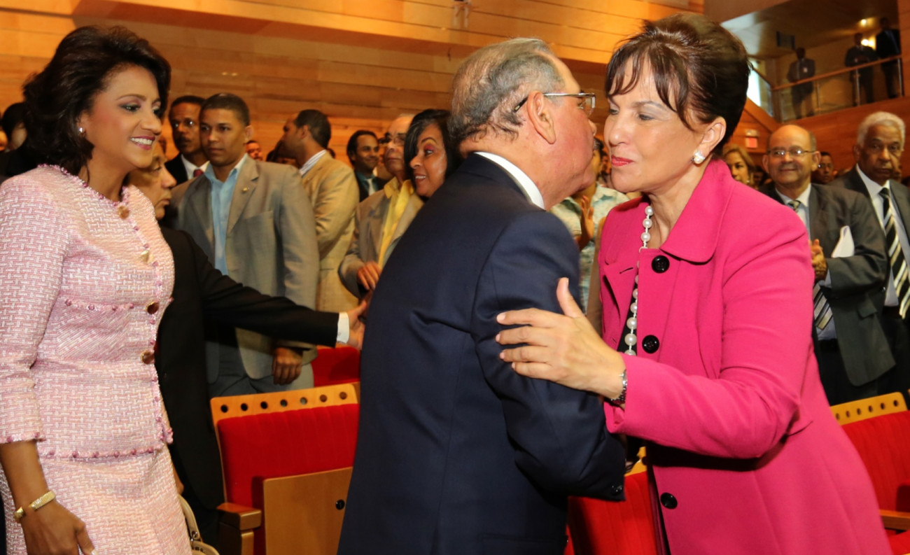 El presidente Danilo Medina,y la primera dama, Cándida Montilla de Medina, al momento de saludar a doña a Peggy Cabral Vda. Peña-Gómez, presente durante el acto del Pacto Nacional para la Reforma Educativa, efectuado en el Auditorio Juan Bosch, de la Biblioteca Nacional, en esta ciudad.