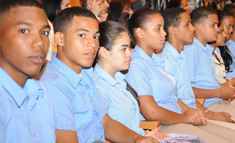 Jóvenes estudiantes, presentes durante el acto del Pacto Nacional para la Reforma Educativa, efectuado en el Auditorio Juan Bosch, de la Biblioteca Nacional, en esta ciudad.