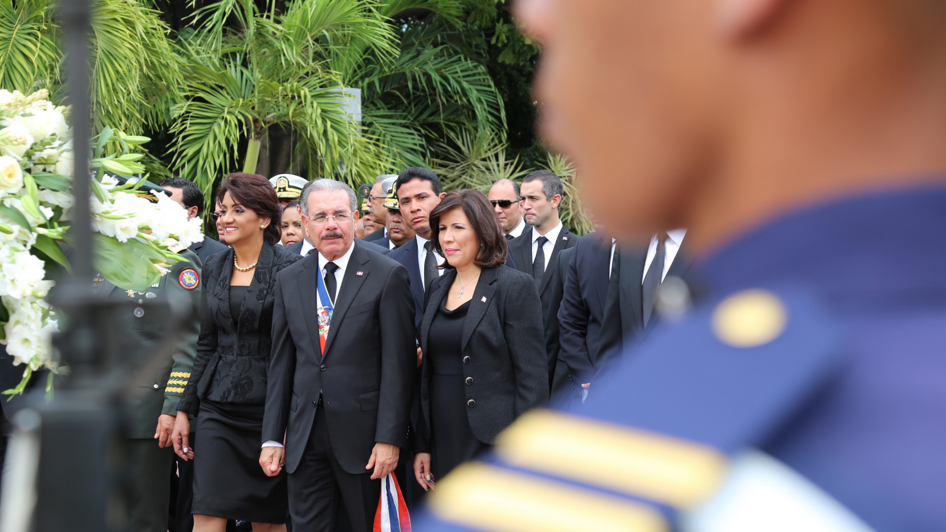 En el Altar de la Patria, el presidente Danilo Medina, acompañado de la primera dama Cándida Montilla de Medina y sus hijas; de la vicepresidenta Margarita Cedeño de Fernández, funcionarios, autoridades civiles y militares, saluda a los asistentes, rindió tributo a los Padres de la Patria.