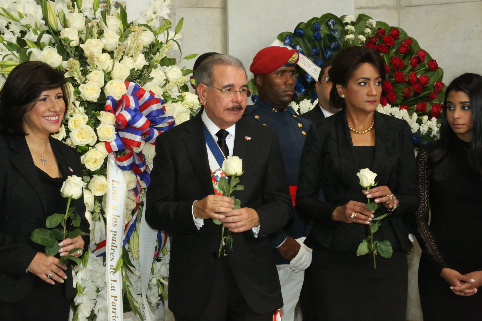 Con la entrega de la ofrenda floral en el Altar de la Patria, el presidente Danilo Medina, acompañado de la primera dama Cándida Montilla de Medina y sus hijas; de la vicepresidenta Margarita Cedeño de Fernández, funcionarios, autoridades civiles y militares, rindió tributo a los Padres de la Patria.