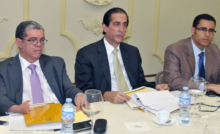 Ministro de la Presidencia, Gustavo Montalvo, junto al ministro de Educación, Carlos Amarante Baret: el presidente de la JCE, Roberto Rosario y otras distinguidas personalidades presentes, durante el encuentro para implementación de tres importantes proyectos en beneficio de estudiantes dominicanos.