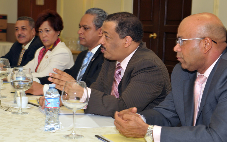 Reunión de trabajo encabezada por el ministro de la Presidencia, Gustavo Montalvo, junto al ministro de Educación, Carlos Amarante Baret; el presidente de la JCE, Roberto Rosario y otras personalidades presentes, durante el encuentro en favor de tres proyectos estudiantiles.
