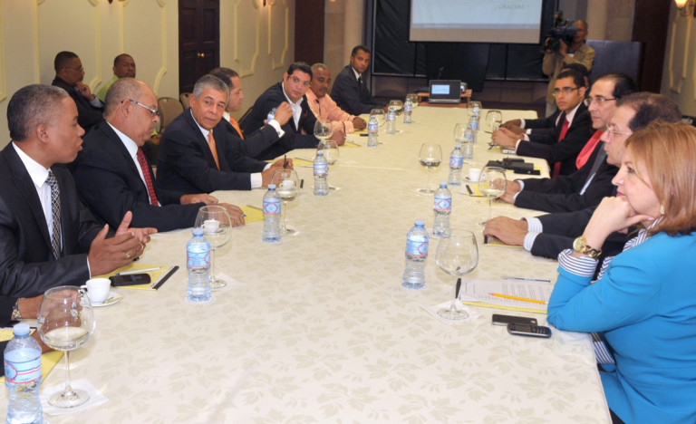 Ministro Gustavo Montalvo junto a los alcaldes del Gran Santo Domingo, presentes durante la reunión sobre utilidad y funcionamiento del Sistema 9-1-1, dispuesto por el presidente Medina. Figuran además, la viceministra, Zoraima Cuello; el consejero del presidente Medina, Juan Jiménez; y el director del Sistema Nacional de Emergencias y Seguridad 9-1-1, Dalvert Polanco.