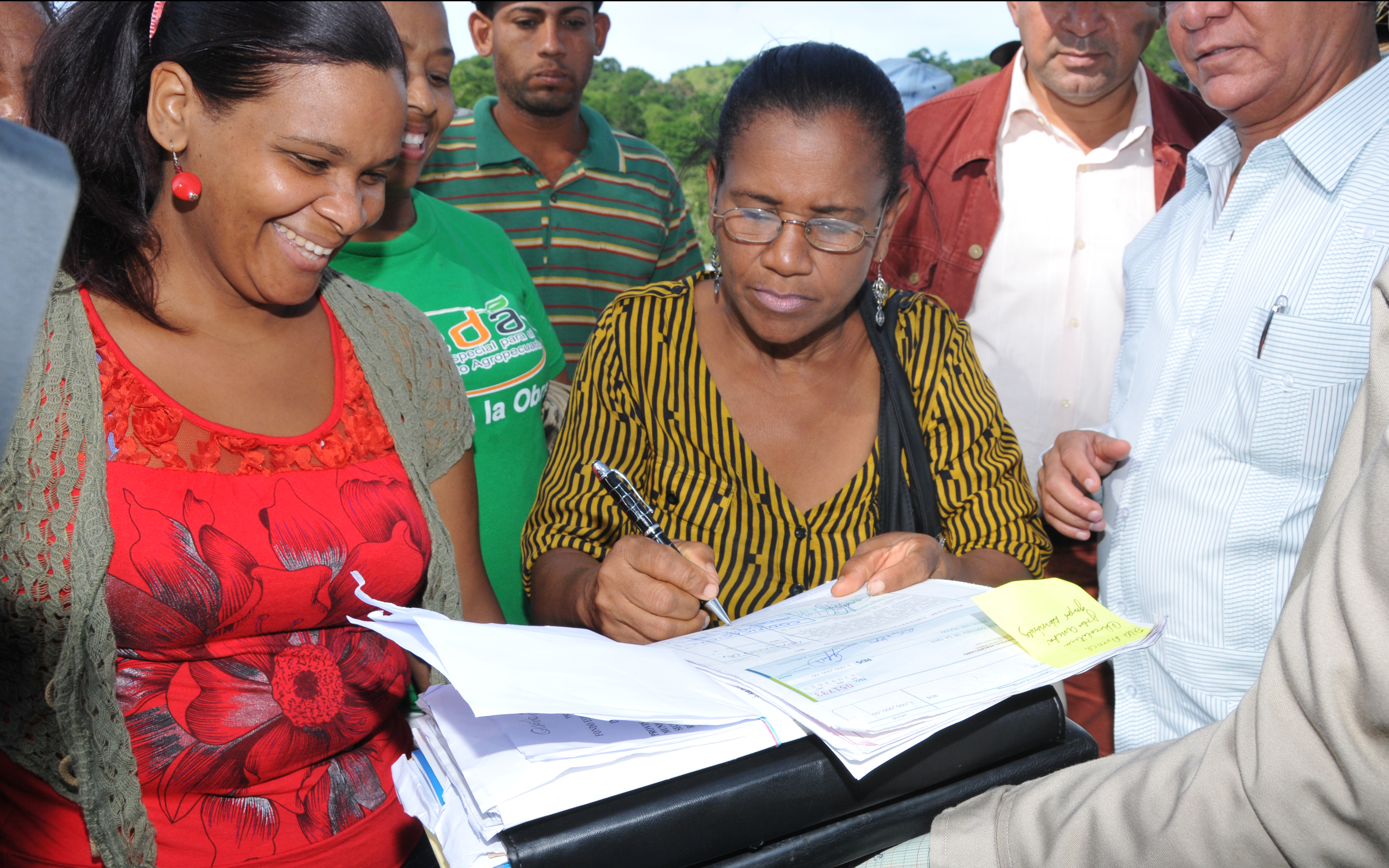 Ana Delia Martínez, presidenta de la Asociación de Mujeres Unidas para Avanzar del municipio Gaspar Hernández, recibe un cheque por tres millones de pesos para la construcción de una chocolatera; dando cumplimento a promesas del presidente Medina en favor de los productores nacionales, mediante el FEDA.