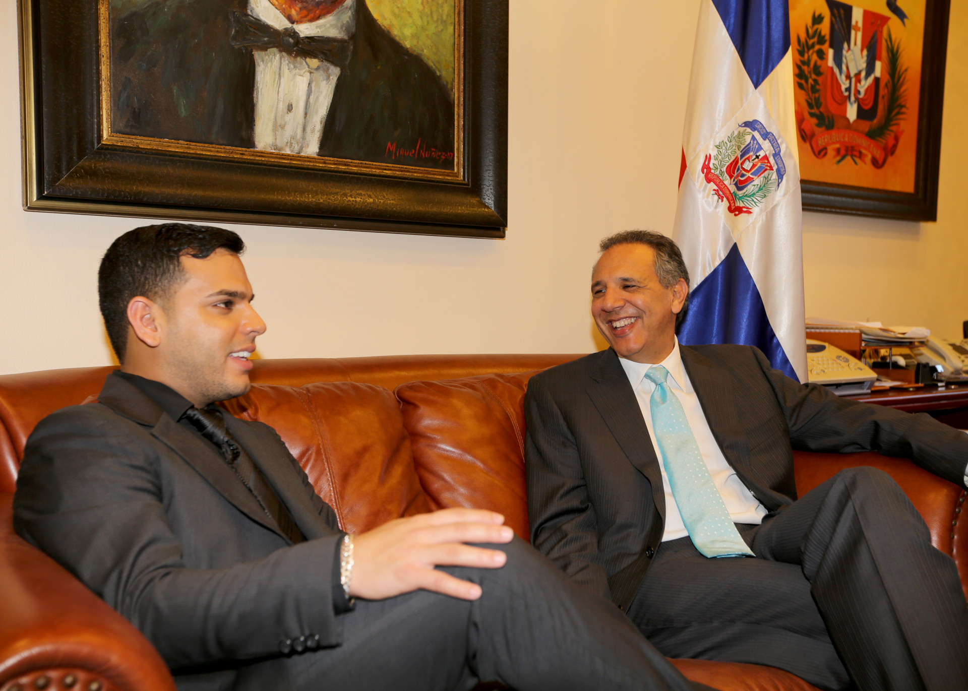 El ministro Administrativo de la Presidencia, José Ramón Peralta, acompañado del intérprete puertorriqueño de música urbana, Tito El Bambino, durante visita de cortesía efectuada al funcionario en su despacho del Palacio Nacional.