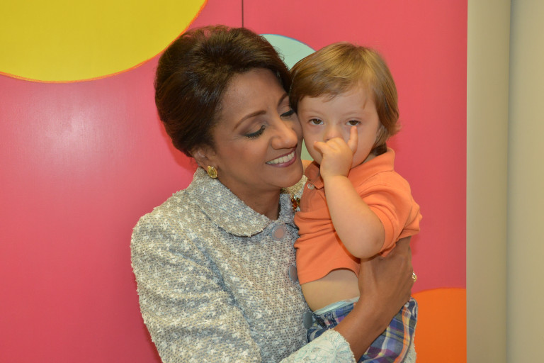 Primera Dama mientras sostiene en brazos infante de condiciones especiales del Centro de Desenvolvimiento Infantil Diferencias, de Portugal.