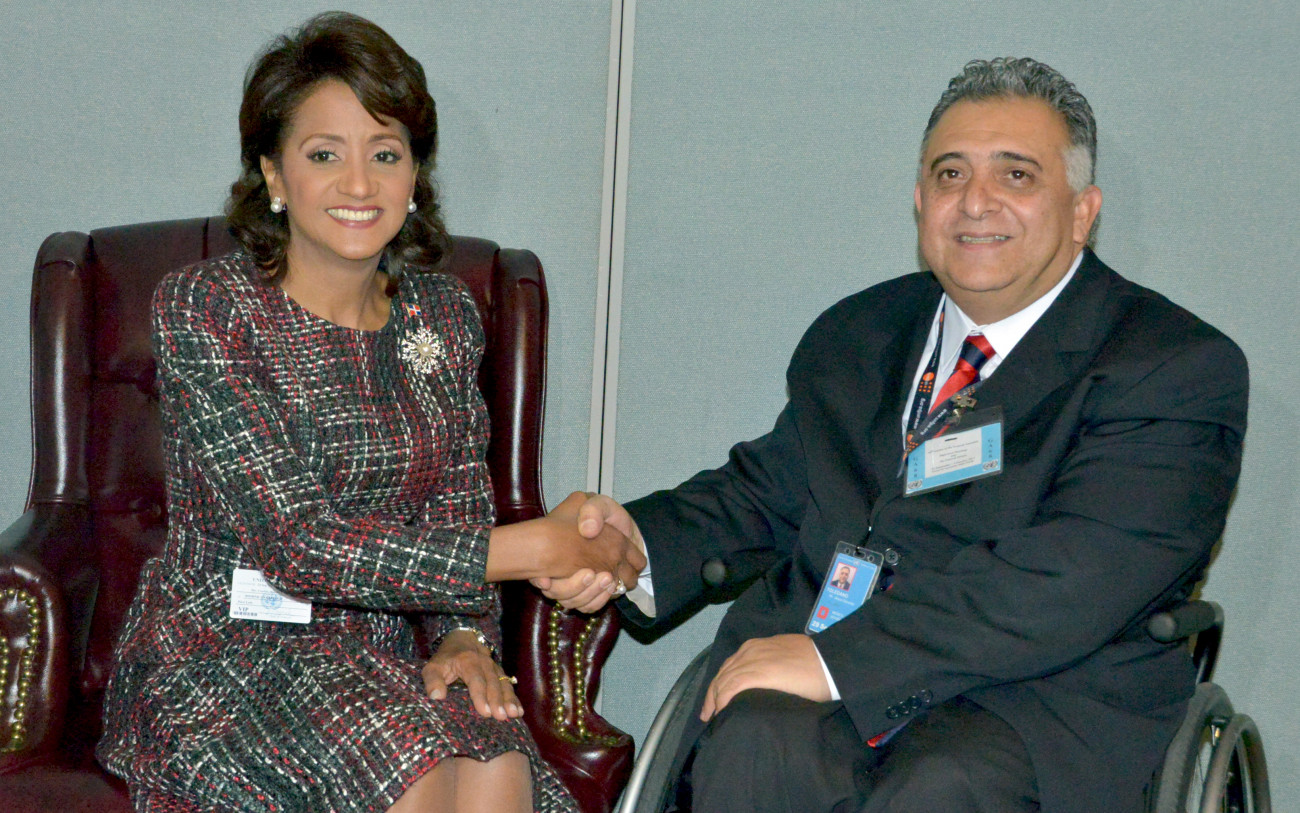 Reunión de la señora Cándida Montilla de Medina con Jesús Eduardo Toledano Landero, director general del Consejo Nacional para el Desarrollo y la Inclusión de Personas con Discapacidad de México, presente en el encuentro de alto nivel de la Asamblea General de la ONU, donde participaron más de 20 representantes de diversos países.