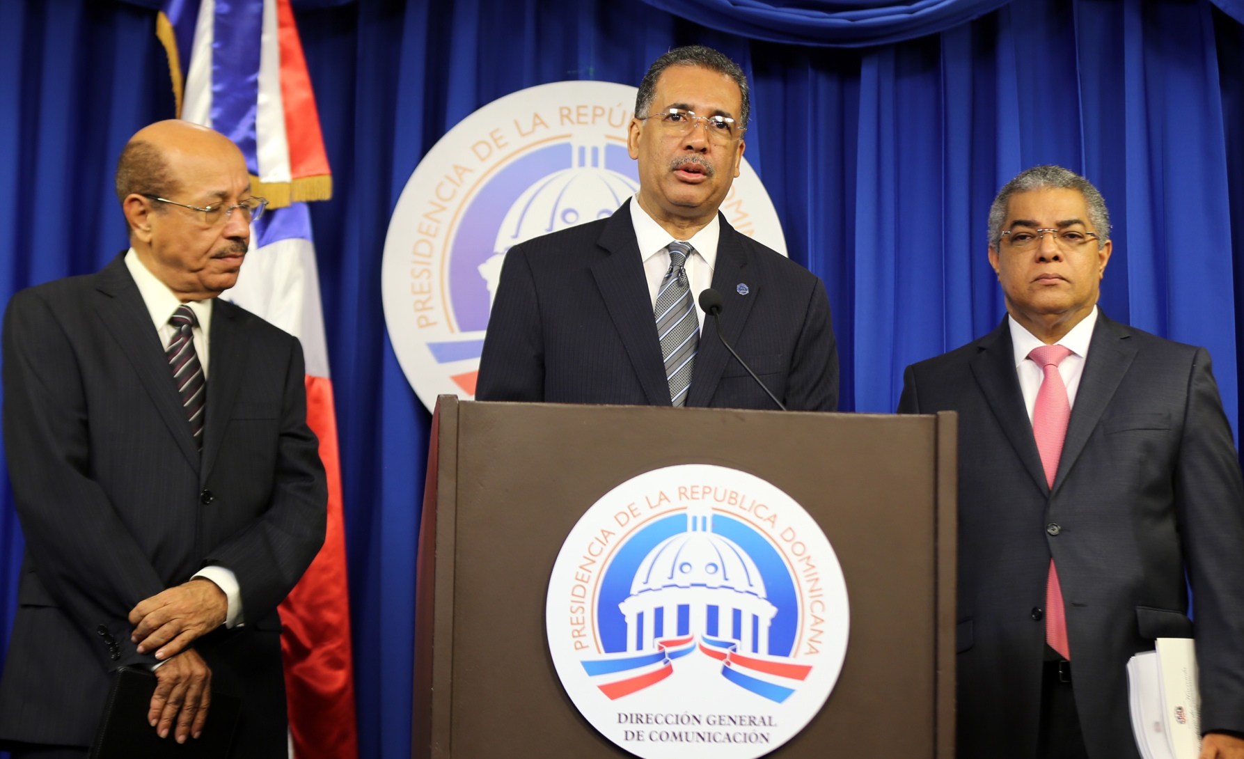 Los ministros de Economía, Planificación y Desarrollo, Temístocles Montás; de Hacienda, Simón Lizardo Mézquita y el director general de Presupuesto, Luis Reyes, presentes en la conferencia de prensa sobre el Presupuesto 2014, efectuada hoy en el Salón Orlando Martínez, del Palacio Nacional.