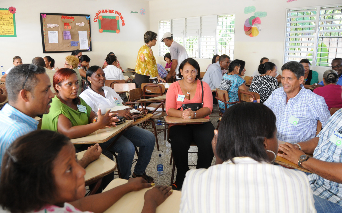 Instructores y comunitarios presentes en las consultas del Pacto Nacional por la Reforma Educativa, efectuadas en el Centro Educativo Juan Arturo Bermúdez, en San Pedro de Macorís.