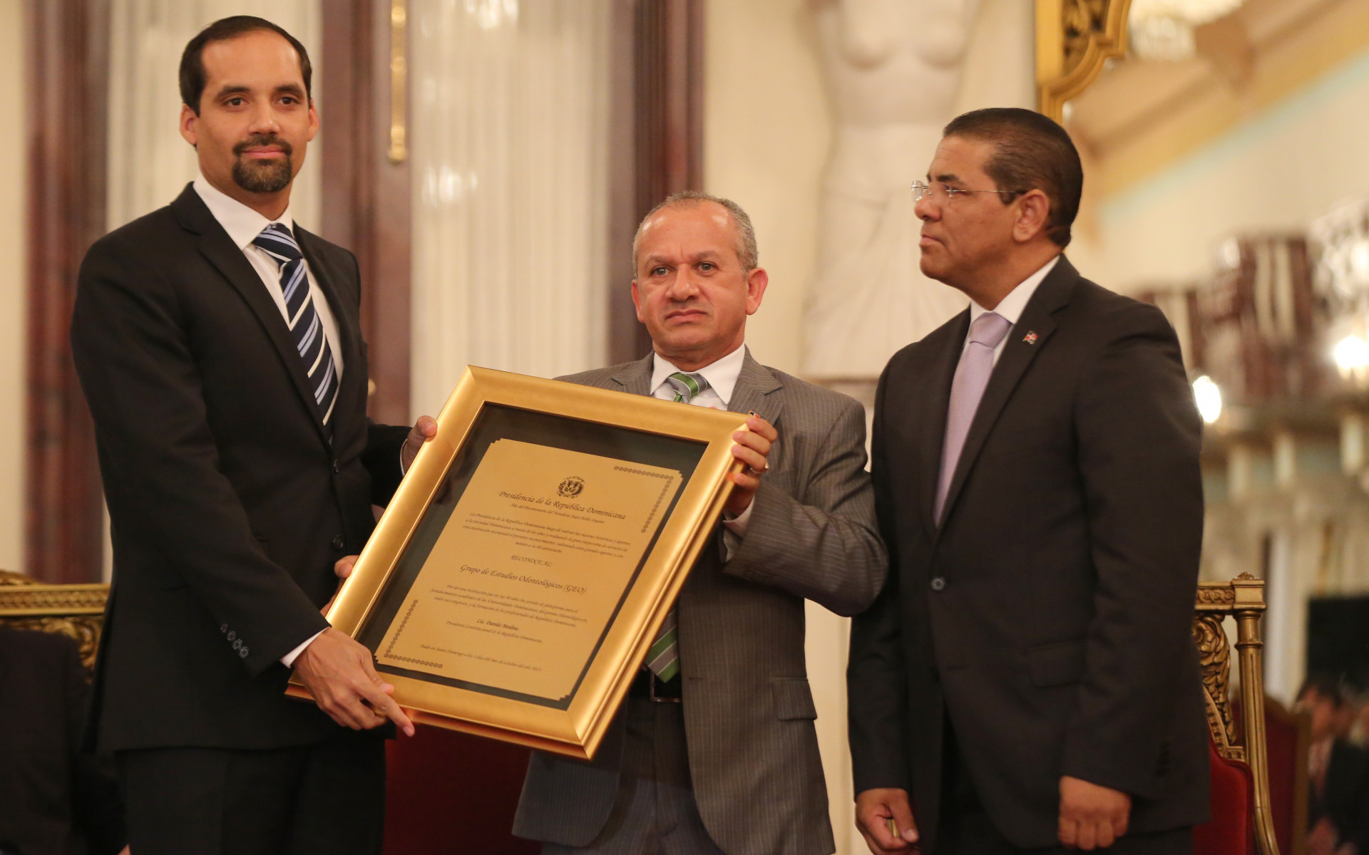 Participantes en la recepción celebrada por el Día del Odontólogo, en el Palacio Nacional, al recibir su reconocimiento, de manos del ministro de Salud Pública, Freddy Hidalgo, quien representó al mandatario en el encuentro.\