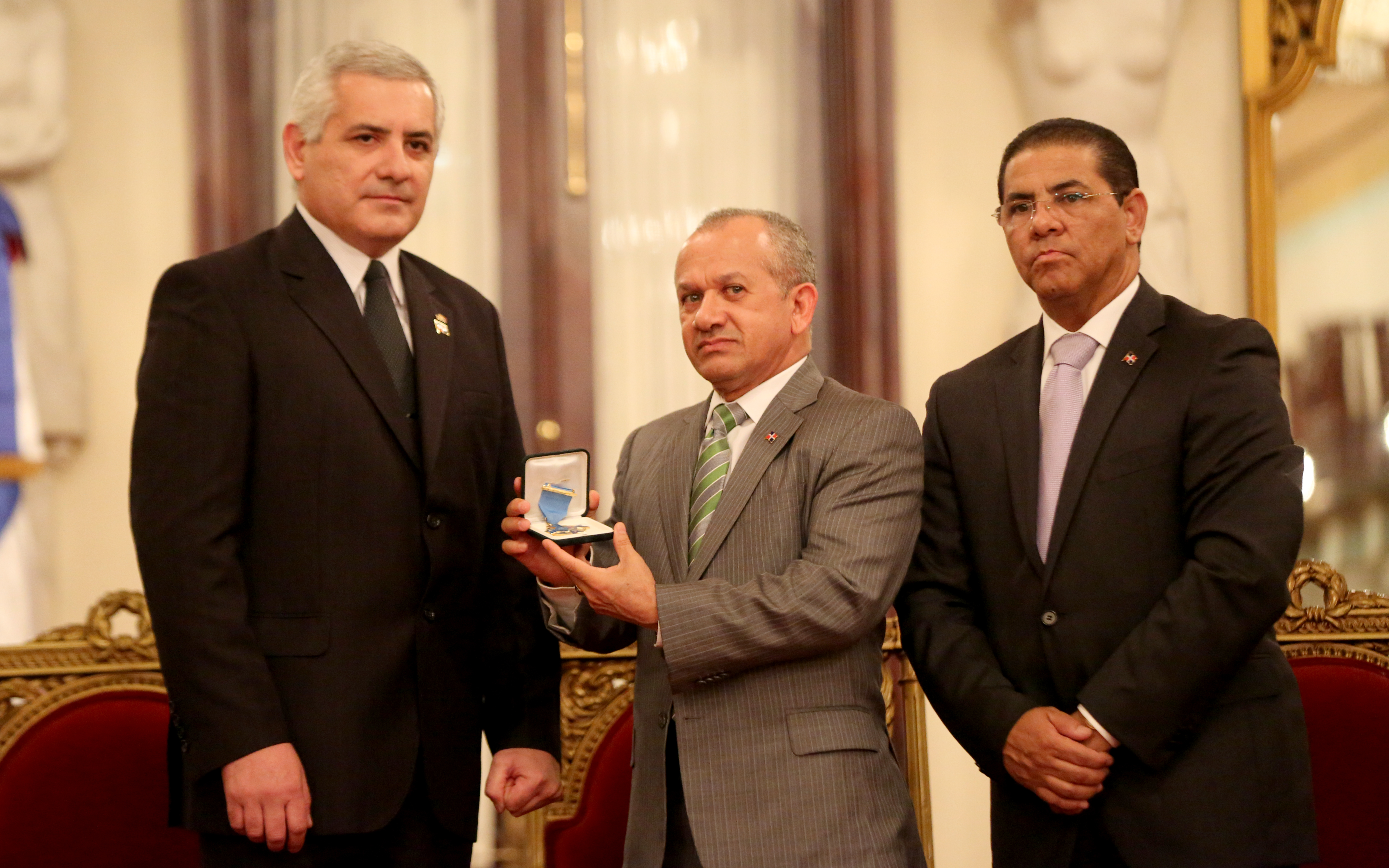 El ministro de Salud Pública, Freddy Hidalgo (al centro), en representación del presidente Danilo Medina recibe la Medalla al Mérito otorgada al Mandatario por directivos de la Federación Odontológica Latinoamericana, durante la recepción por el Día del Odontólogo.