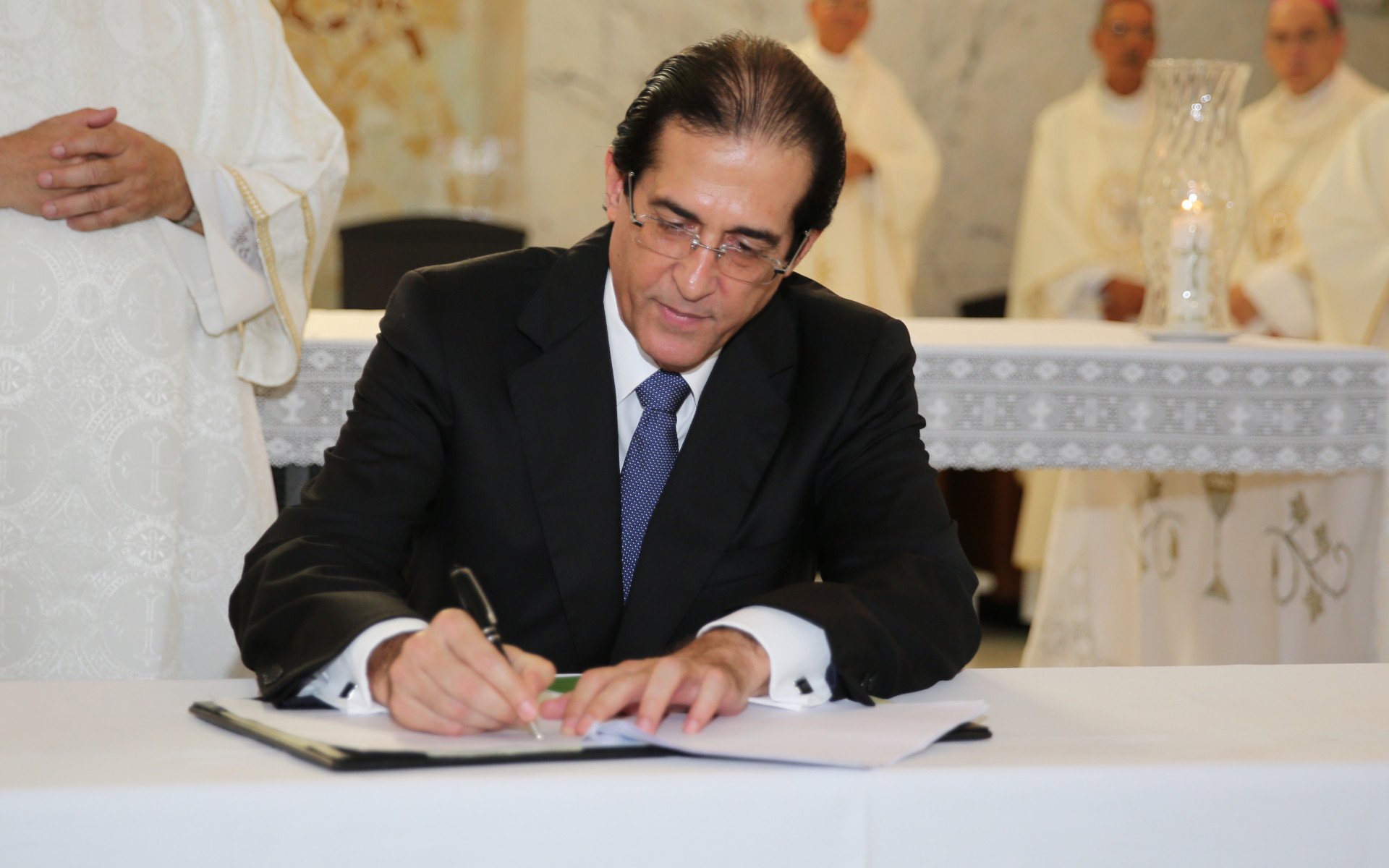 Ministro Gustavo Montalvo, al momento de firmar como testigo del acuerdo-compromiso con la Conferencia del Episcopado Dominicano, donde la Iglesia Católica ofrecerá su apoyo al Plan de Alfabetización.