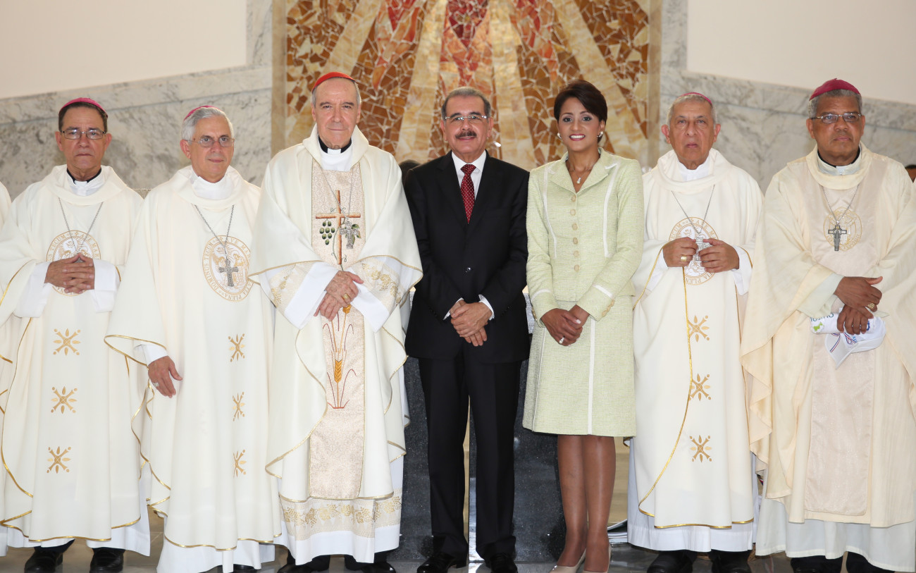 Participación del presidente de la República, Danilo Medina junto a su señora Cándida Montilla de Medina; monseñor Nicolás de Jesús Cardenal López Rodríguez y obispos presentes durante la firma del acuerdo-compromiso con la Conferencia del Episcopado Dominicano, donde la Iglesia Católica ofrecerá su apoyo al Plan de Alfabetización
