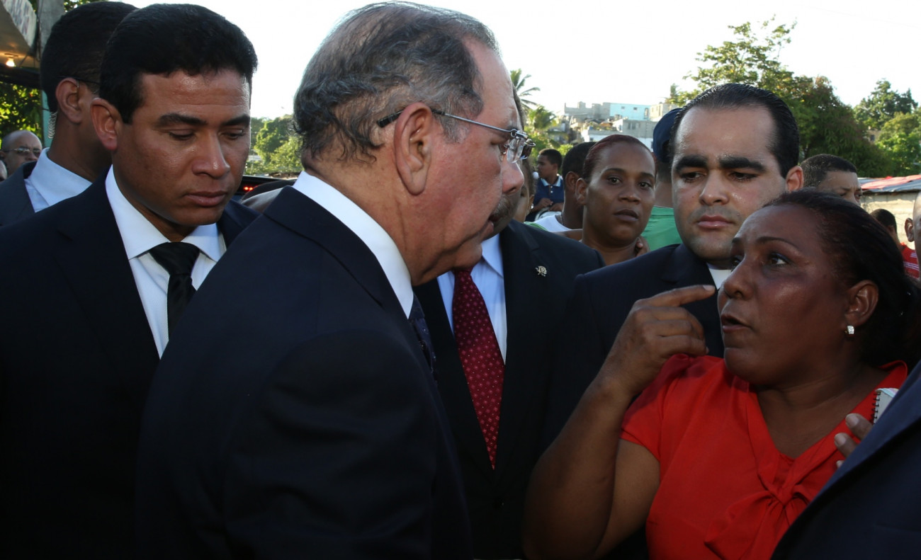 El Mandatario al escuchar inquietudes de vecinos de La Cañada Benavides y a quienes además les anunció que construirán un muro para evitar las inundaciones producidas por las crecidas del río Ozama.