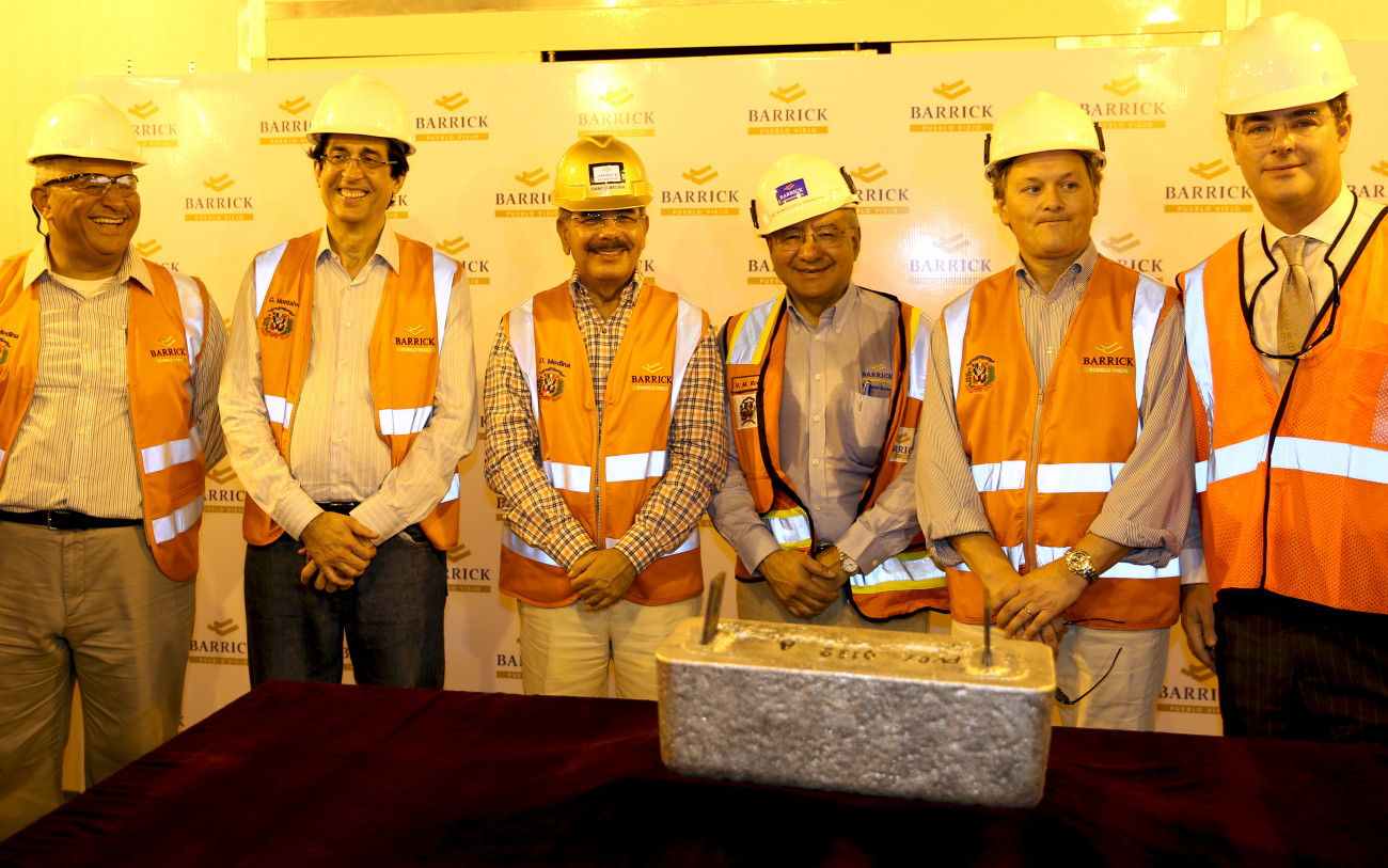 El presidente Medina junto a Manuel Rocha, presidente de la Barrick Pueblo Viejo: Kelvin Dushinsky; Manuel Diez Cabral; el embajador George Boissé, y el ministro Gustavo Montalvo, presentes durante el recorrido del Mandatario por las instalaciones de la empresa, que incluyó poder presenciar el proceso final de fundición y vertido del oro.
