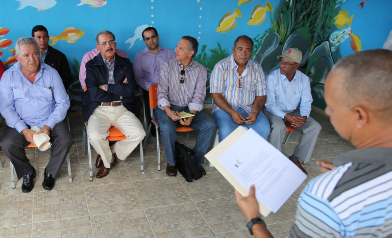 Vista del encuentro del presidente Medina con pescadores de la sección La Barca, en San Pedro de Macorís, durante su Visita sorpresa este domingo.
