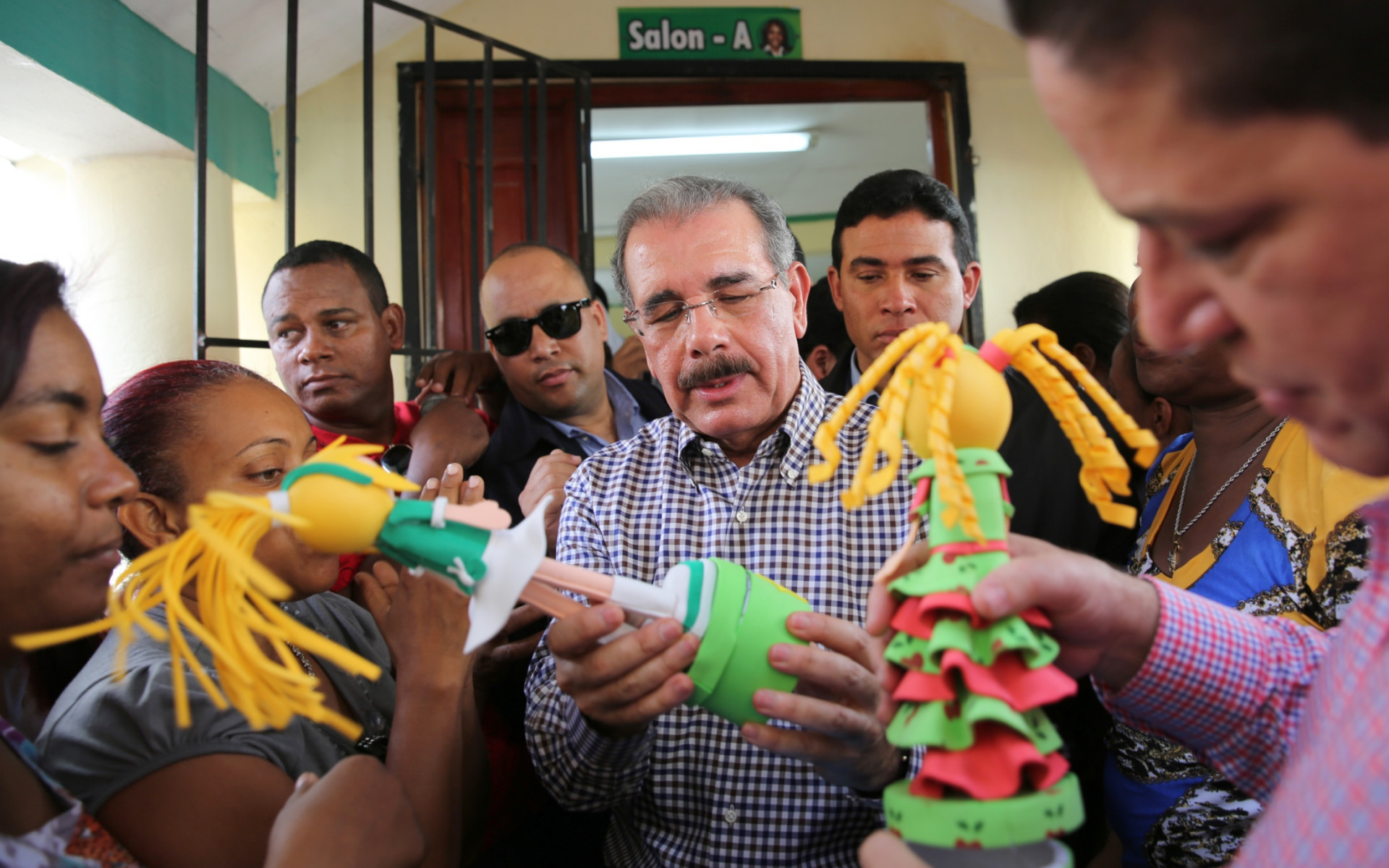 El presidente Medina mientras observa muestras de artesanía producidas por mujeres de Zonas Francas de Ingenio Porvenir, presentes durante la Visita Sorpresa del Mandatario a la zona.