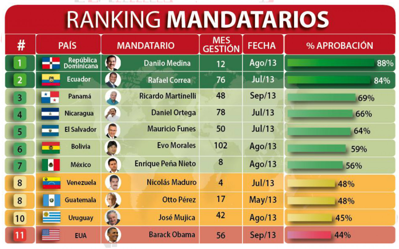 Gráfica del sondeo de mandatarios de la empresa mexicana Consulta Mitofsky, de octubre 2013, que refiere al presidente de la República, Danilo Medina Sánchez, con la mayor aprobación ciudadana en América, por promedio de 88 por ciento en la clasificación de mayor a menor, útil para establecer criterios de valoración.