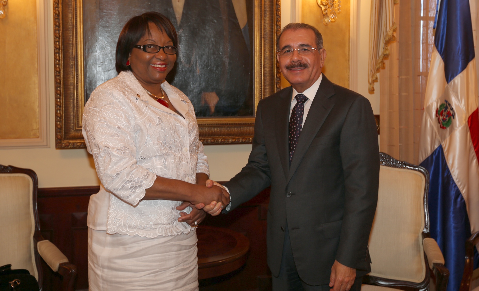Vista del momento en que el presidente de la República, Danilo Medina, recibe a la señora Carissa F. Etienne, directora de la Organización Panamericana de la Salud (OPS), quien manifestó su apoyo a las políticas de salud que aplica el Gobierno.