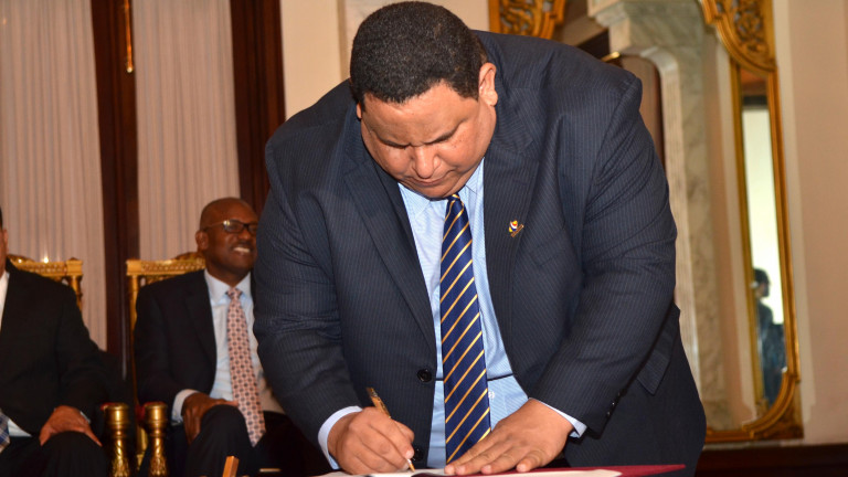 Rafael Hidalgo, presidente de la Federación Dominicana de Municipios, mientras procede a firmar dicho convenio.