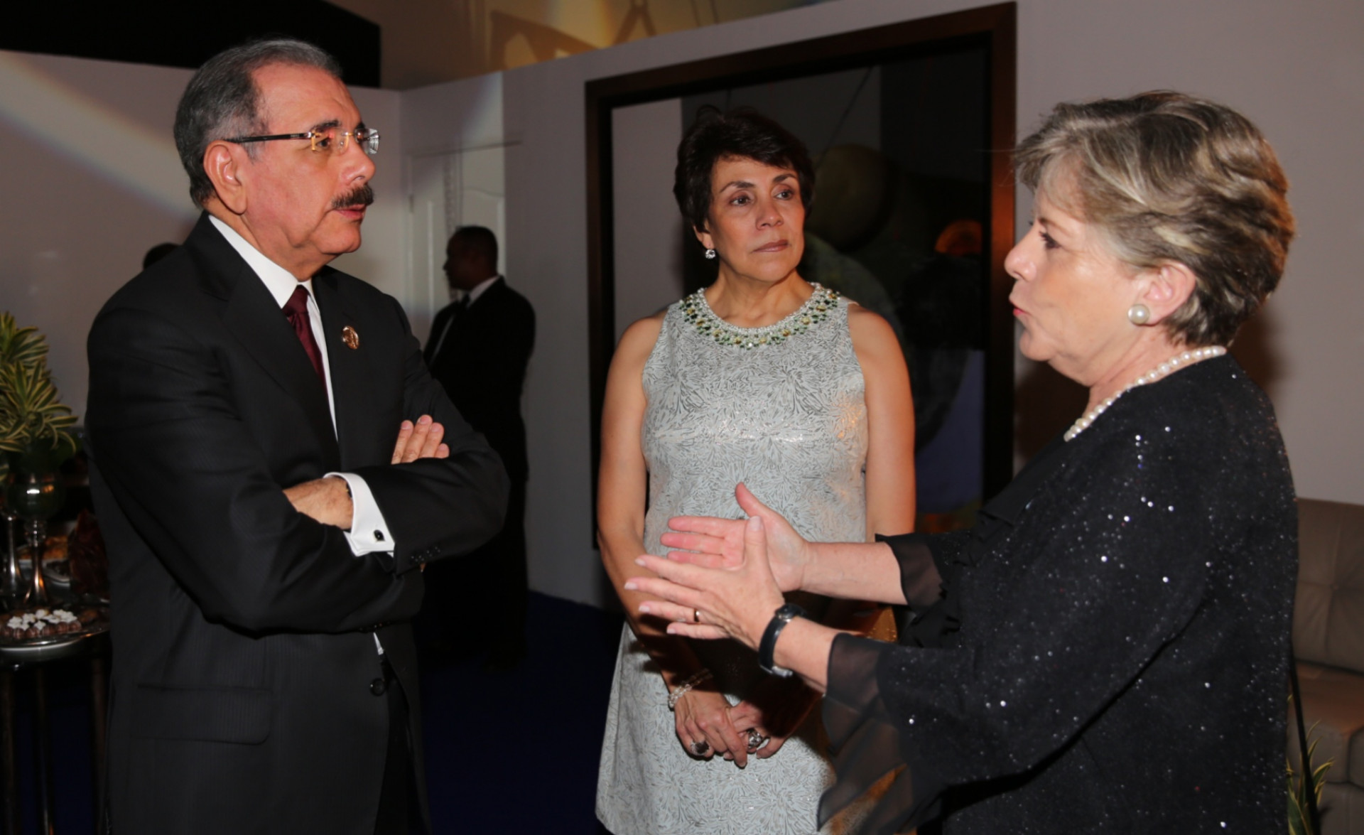 El presidente Danilo Medina mientras comparte con la señora Alicia Bárcena, directora ejecutiva de la CEPAL y acompañante, presentes durante el acto inaugural de la XXIII Cumbre Iberoamericana de Jefes de Estado y de Gobierno, celebrado en la ciudad de Panamá.