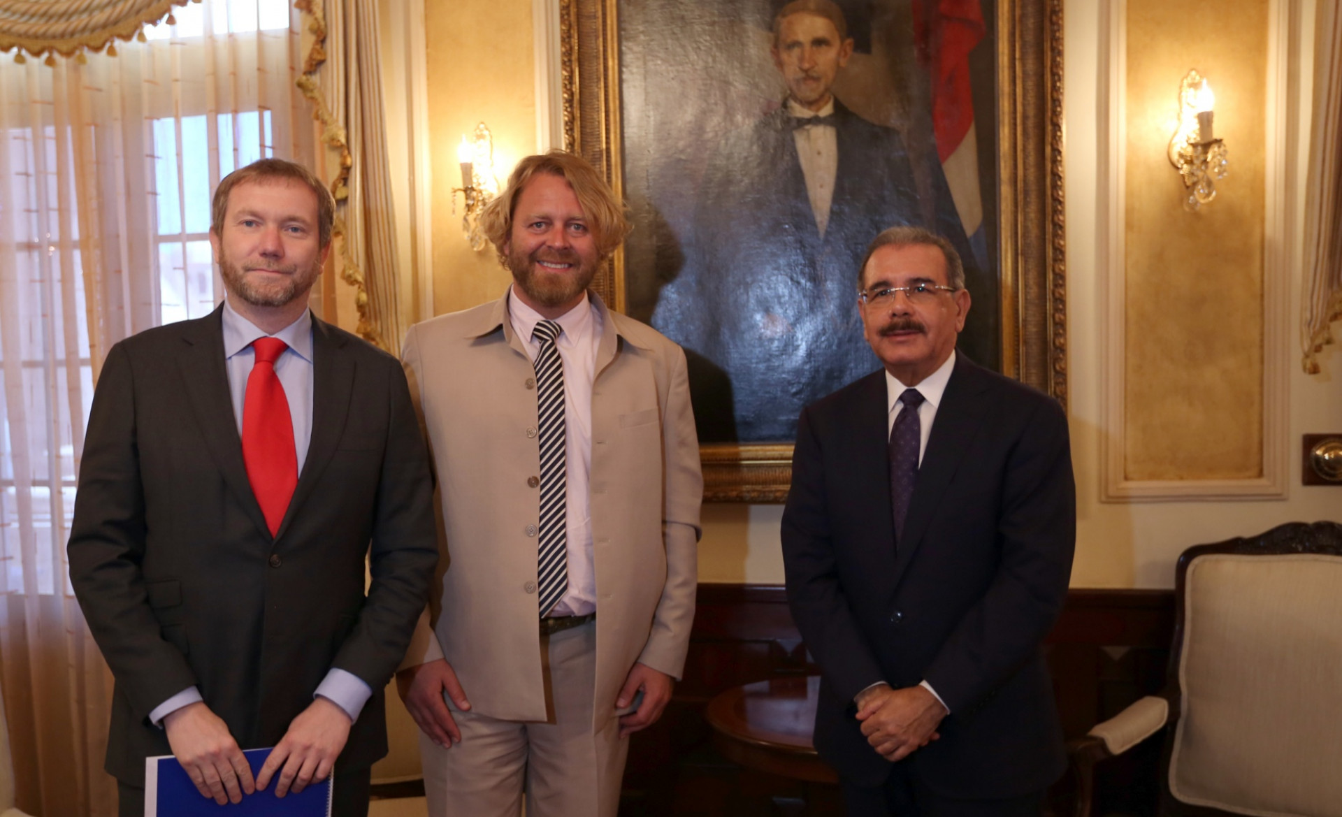El presidente Danilo Medina junto a los señores David Masson y Gardar Forberg, durante visita de cortesía recibida en su despacho del Palacio Nacional.