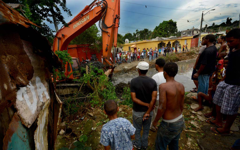 Trabajos de saneamiento que se realizan a la Cañada Bonavides, que separa los barrios de Los Guandules y de La Ciénaga,.de esta capital, ordenados por el presidente Danilo Medina, en favor de familias afectadas.