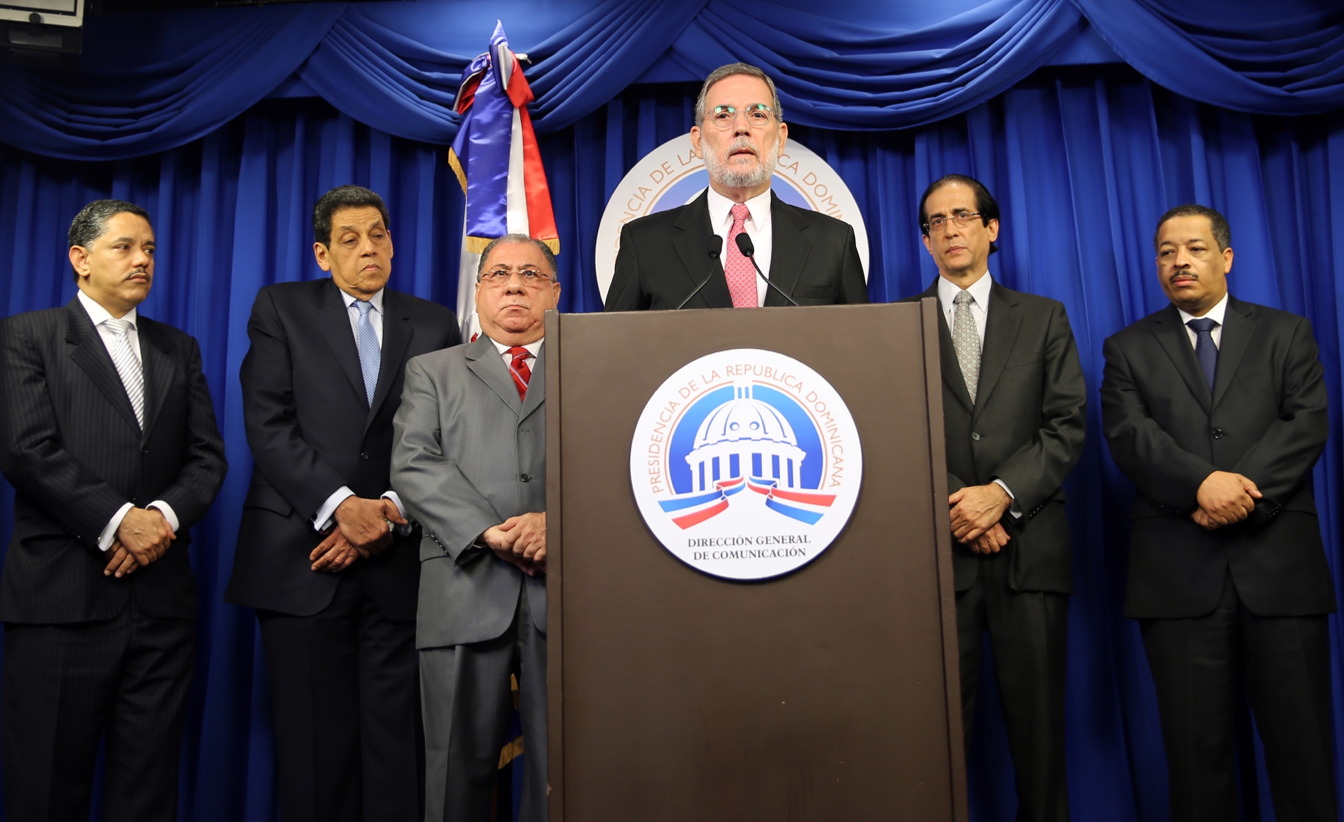 Roberto Rodríguez Marchena, portavoz del Gobierno, al dar lectura a la Declaración oficial en torno a la Sentencias del Tribunal Constitucional TC168-13, junto al ministro de la Presidencia Gustavo Montalvo y el consultor Jurídico del Poder Ejecutivo, César Pina Toribio, presentes durante la conferencia de prensa efectuada hoy en el Salón Orlando Martínez, del Palacio Nacional. Figuran además, los miembros del Consejo Nacional de Migración, José Ricardo Taveras, director General de Migración; Roberto Rosario Márquez, presidente de la Junta Central electoral y el ministro de Interior y Policía, José Ramón Fadul, quien lo preside.