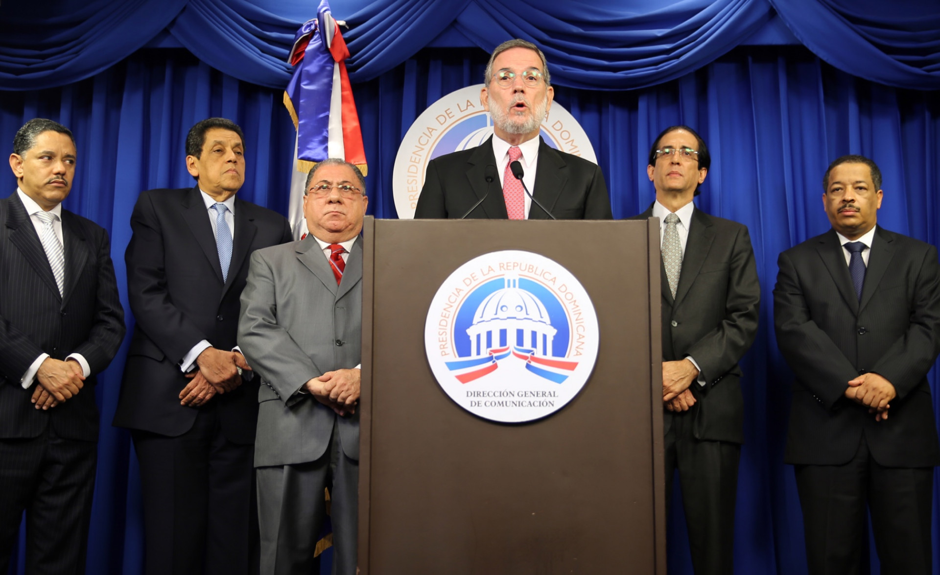 Conferencia de prensa encabezada por el señor Roberto Rodríguez Marchena, director de la Dirección General de Comunicación de la Presidencia (DICOM), junto a los ministros y funcionarios presentes, donde se da a conocer el documento descrito como Declaración oficial en torno a la Sentencias del Tribunal Constitucional TC168-13, en el Salón Orlando Martínez del Palacio Nacional.