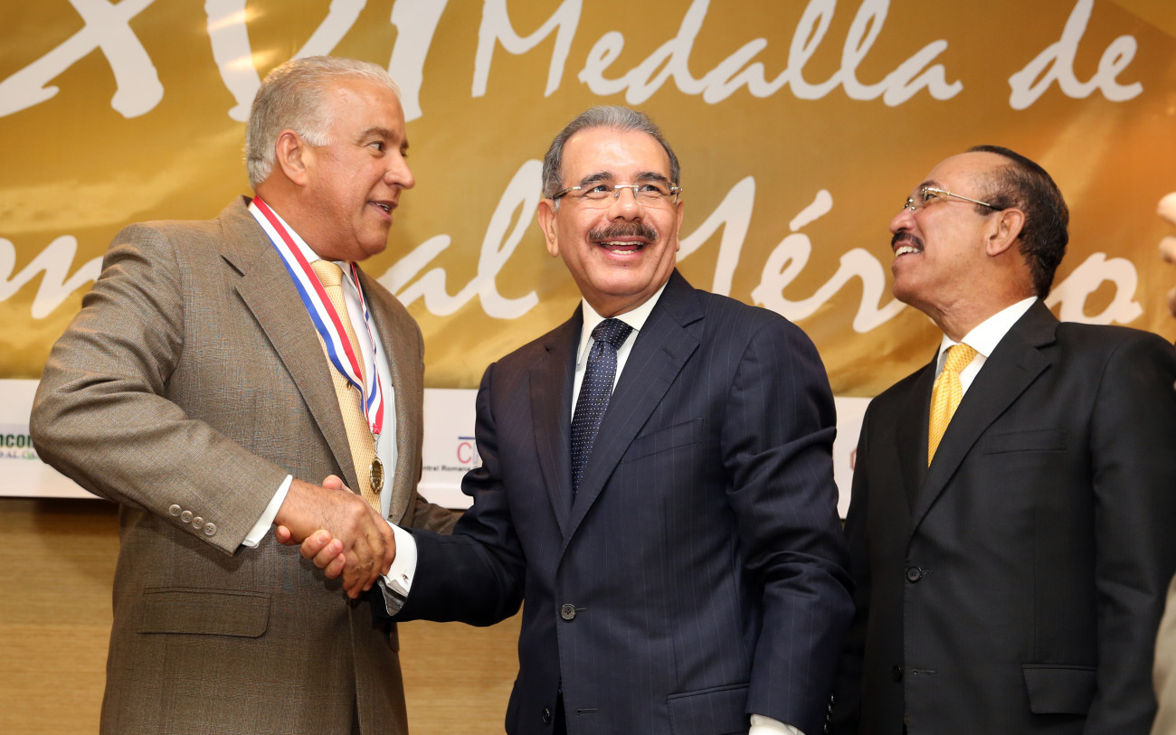 El presidente de la República, Danilo Medina felicita a Andrés Bautista, por sus méritos como productor agropecuario, durante ceremonia de entrega de Medallas al Mérito otrogadas a 15 destacados productores agropecuarios y hacendados del pais, organizado por la Asociación Dominicana de Hacendados y Agricultores (ADHA.