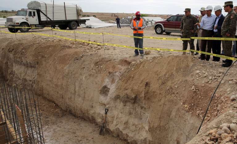 Recorrido del Ministro Peralta por el área de construcción de la obra, donde se aprecia el avance del revestimiento en los muros de gaviones, para salvaguardar la zona de las inundaciones provocadas por el Lago Enriquillo.